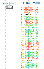 Force symbols - means in the top - strong trend (green - up, red - down), in bottom - no trend symbols. Button Revs can reverse this list.