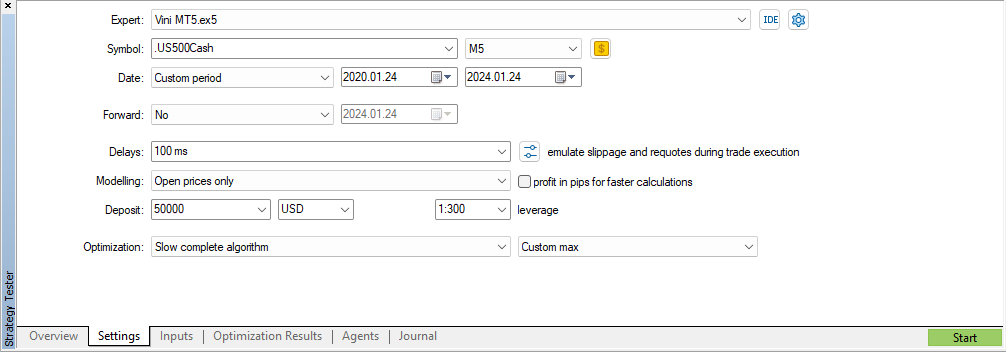 The optimization of the EA is done monthly (from version 1.122 onwards), considering historical data from the last 4 years and using the following settings in the trading platform's Strategy Tester (Ctrl+R):