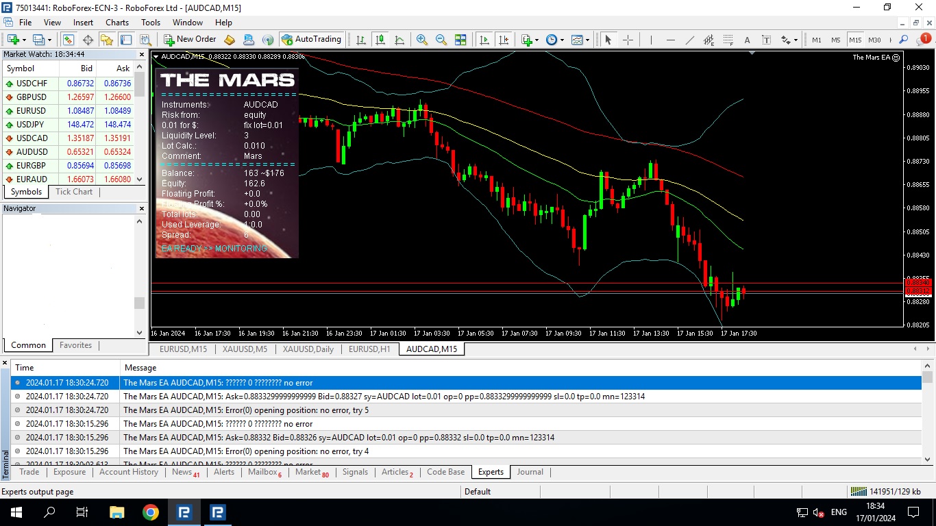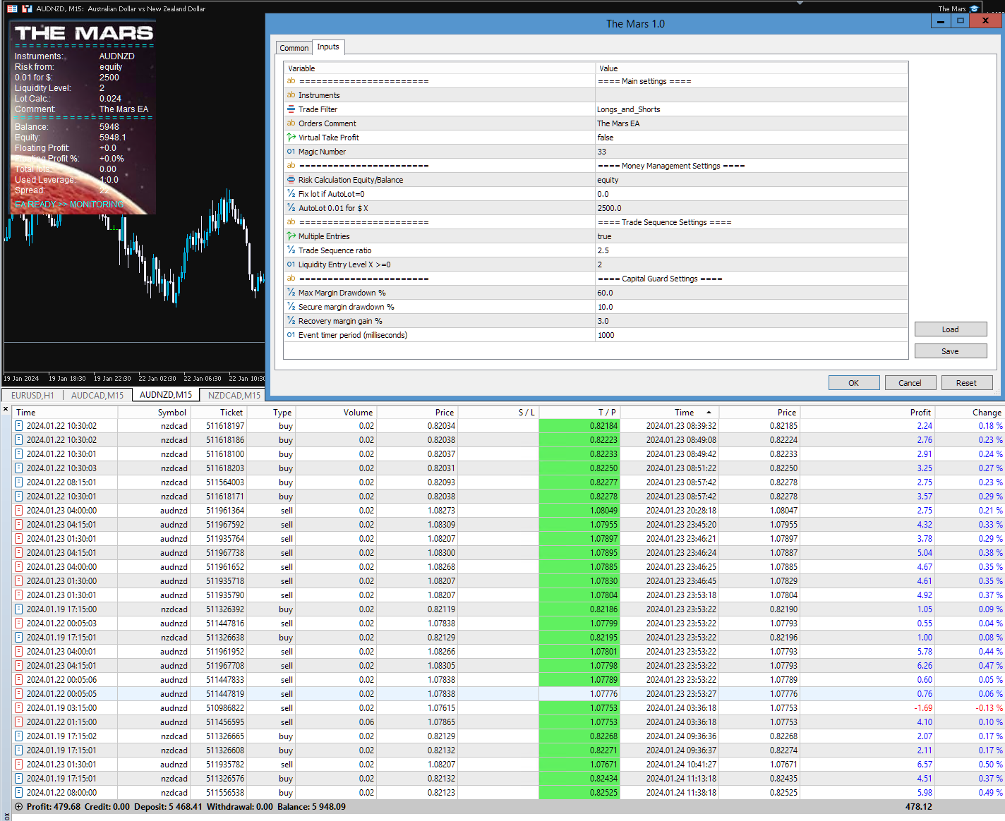 Now I am running the EA on XAUUSD on M1 timeframe. The EA is giving warnings continuously, but it opens trades at LQ3 and with nice profit.