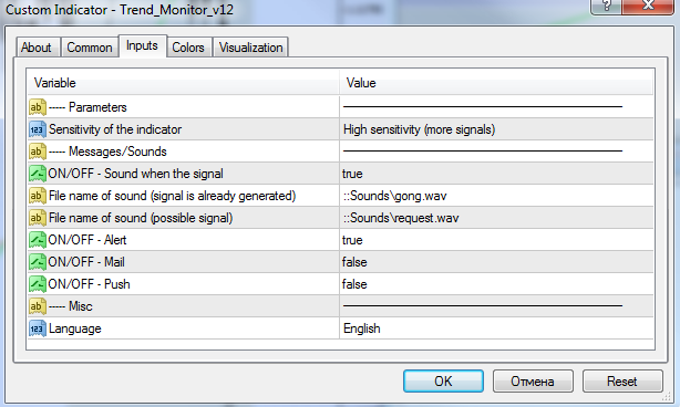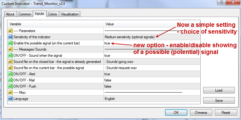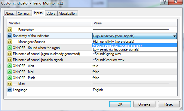 Indicator settings are greatly simplified, since version 1.2. Now, the whole set of filter settings reduced to a single parameter - the choice of the sensitivity setting "Sensitivity of the indicator". The parameter can have the following values: