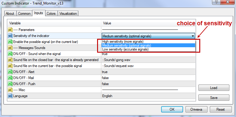 Обращаю Ваше внимание, что начиная с версии 1.2 настройки индикатора не соответствуют описанию на первой странице! Теперь всё множество сложных настроек фильтров сведено к одному простому параметру - выбору чувствительности “ Sensitivity of the indicator ” (см. рисунок):