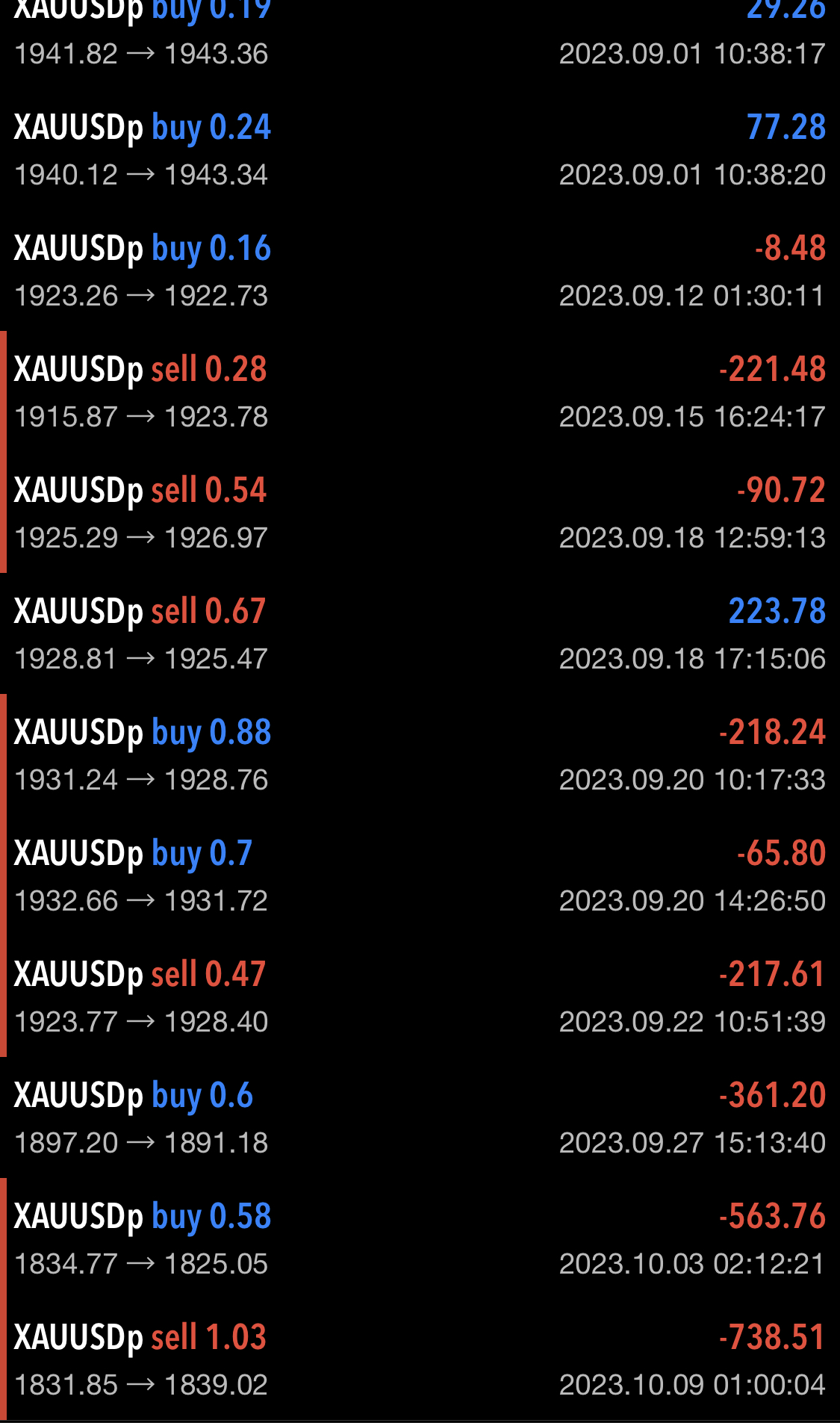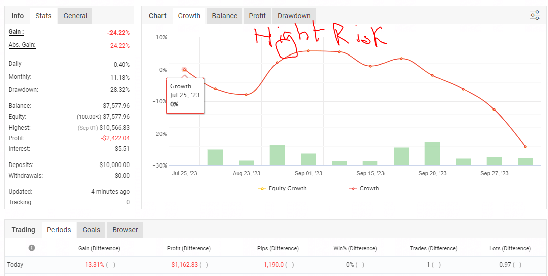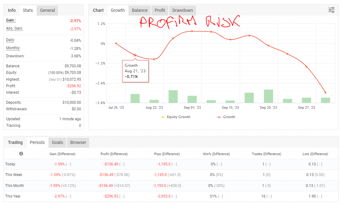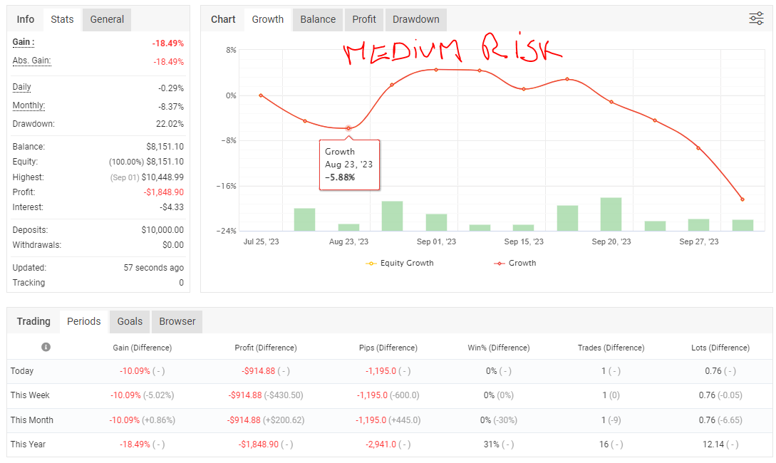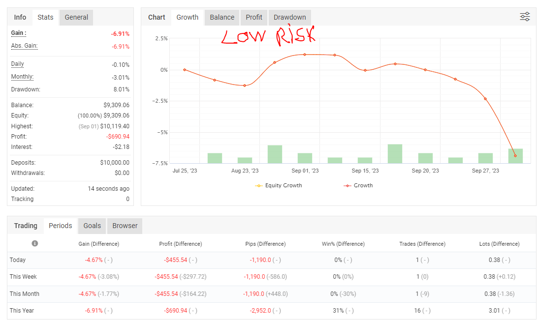 Le mois de septembre fut déficitaire, en proposant des trades contre tendance, j'espère que le mois d'octobre sera positif même si effectivement les performances passées ne constituent pas une prédiction des performances futures.