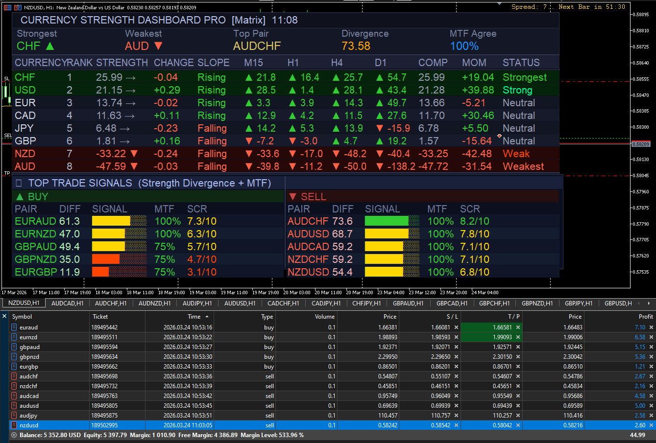 Currency Strength Dashboard Basic Kostenlose Version des professionellen Currency Strength Dashboard Pro für MetaTrader 5 . Der Indikator berechnet die Stärke von 8 Hauptwährungen (EUR, USD, GBP, JPY, CHF, AUD, CAD, NZD) über 28 Währungspaare auf mehreren Zeitrahmen und zeigt die Ergebnisse als interaktives Panel im Chart an. Funktionen der Basic-Version Vollständige Tabelle aller 8 Währungen mit Rang, Stärke, Veränderung und Werten für die Zeitrahmen M15, H1, H4, D1 . Zusammenfassungsblock