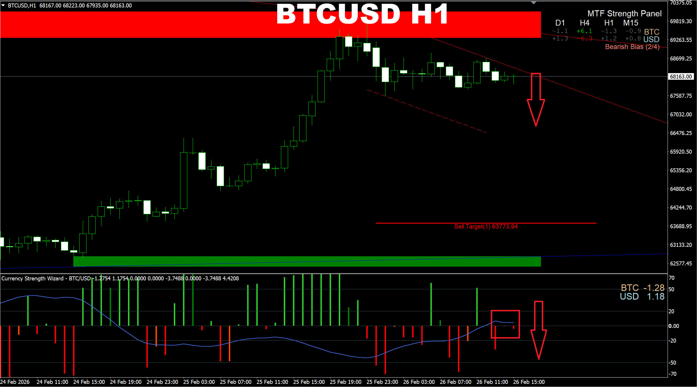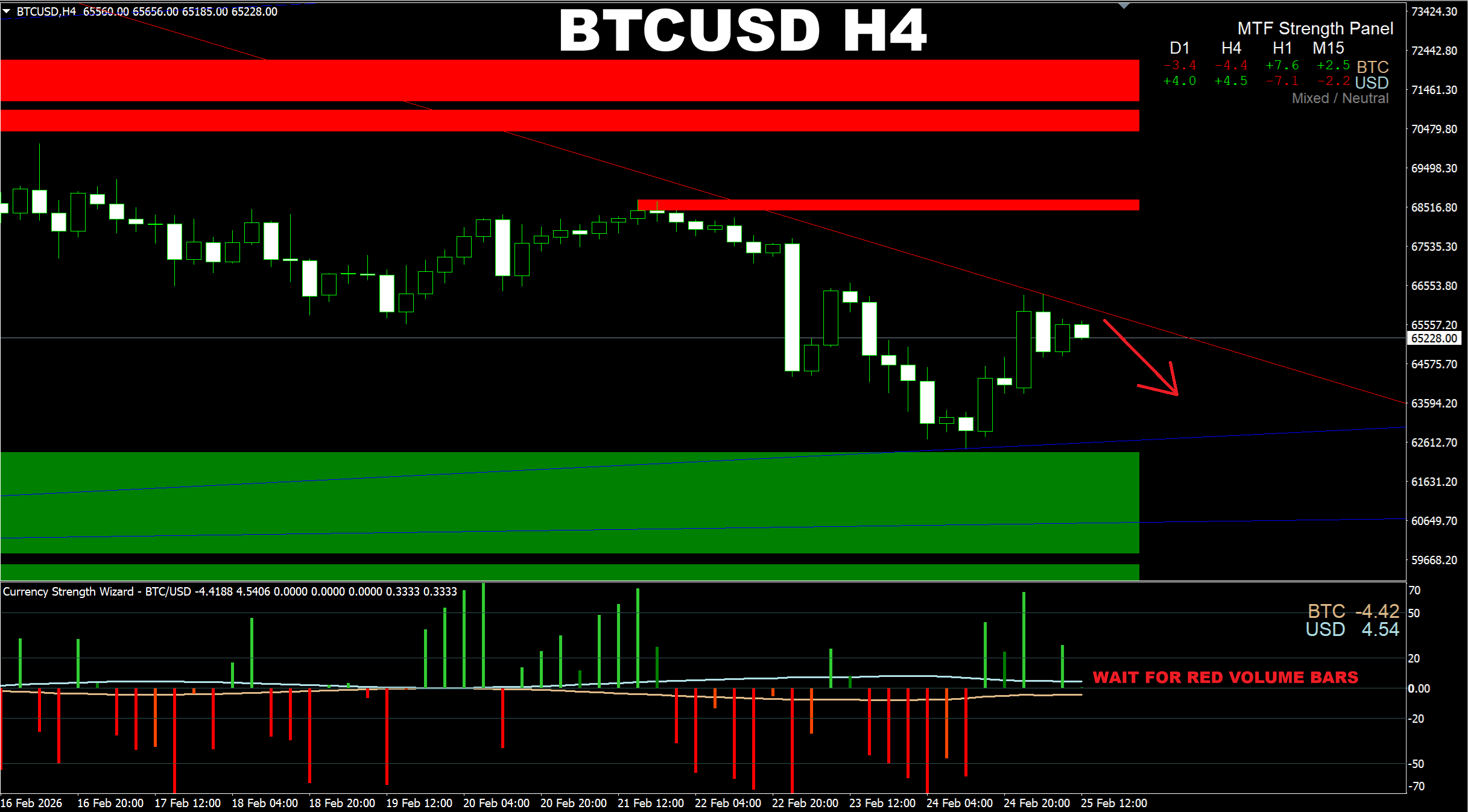 Currency Strength Wizard. BTCUSD H4. Recent pullback is not fully completed yet but there are signs that the SELL wave is coming soon. Though it is recommended to wait for the red volume bars and change of the strength bias to Bearish for extra confirmation.