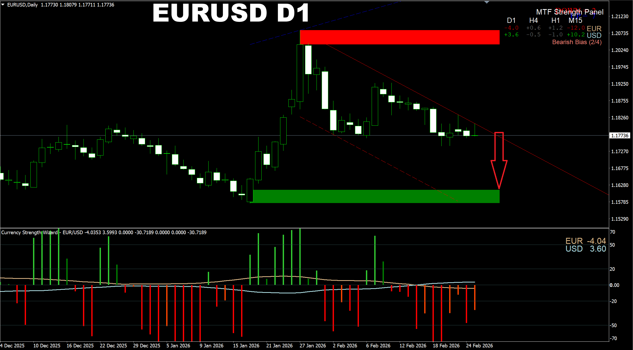 Currency Strength Wizard. EURUSD D1. A new big sell wave may start soon. Price is being traded at Support area on H4 and H1. If it breaks the SR on these time frames, the price will go down to the Support based on the D1 time frame.