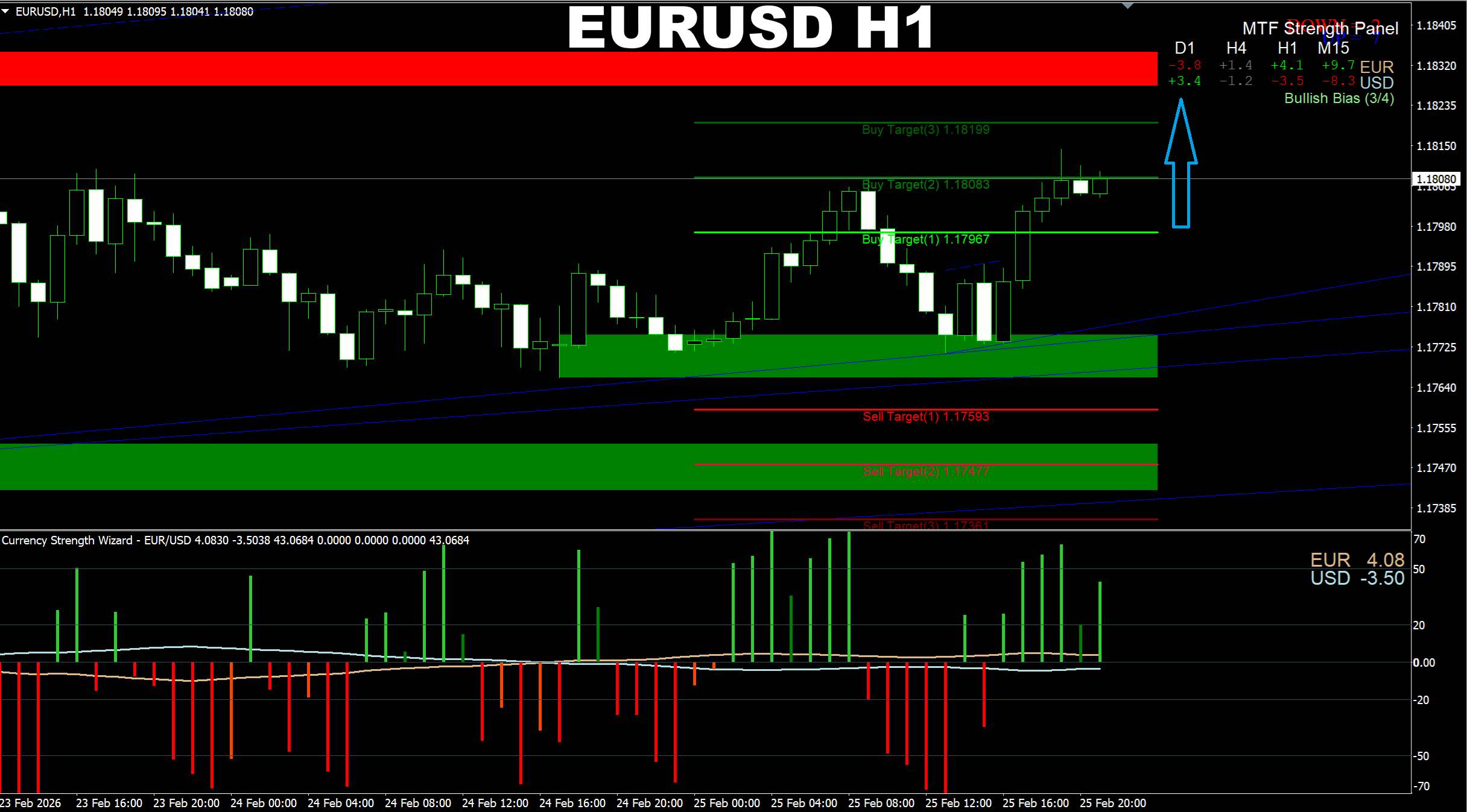 Currency Strength Wizard. EURUSD H1. The price may go a bit higher as the bias is still bullish. Though we need to be aware of possible change to SELL as the current UP move is the pullback on D1 where the strength is SELL.