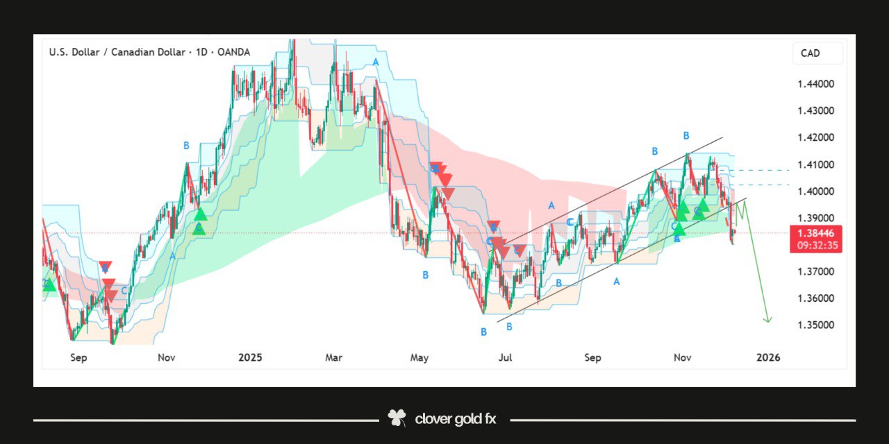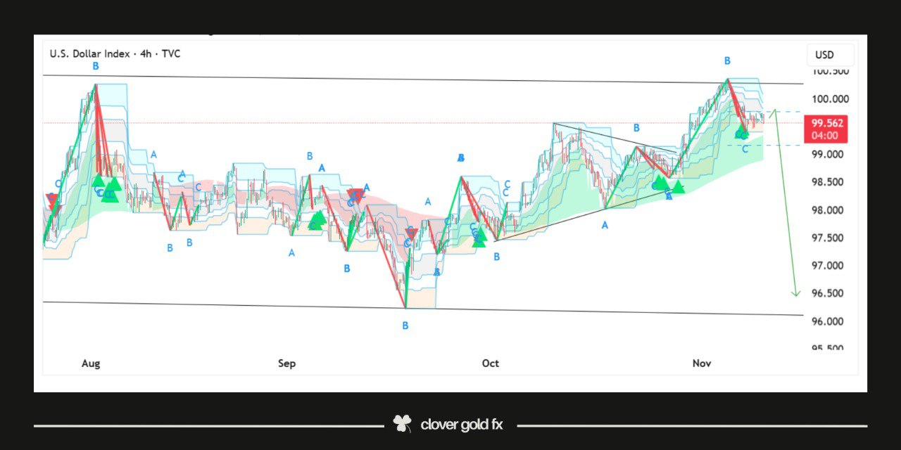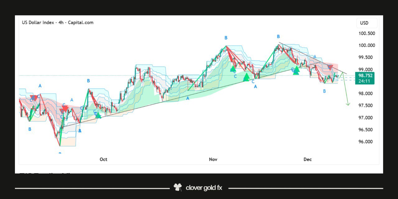 DXY 4H chart has completed a clear five wave impulsive structure topping at wave 5 before breaking below thi major blue trend line drawn from wave 2 to wave 4, signaling a shift from bullish momentum into a corrective phase. After forming wave a price is now attempting a weak wave b pullback that is struggling near the previous support-turned-resistance and the dotted bearish trend line, keeping the market vulnerable for a further drop toward the anticipated wave c zone around 98.00. This technical bearish setup aligns strongly with current fundamentals as slowing U.S. inflation, softer labor market data, and weakening consumer spending are increasing expectations of upcoming Federal Reserve rate cuts reducing the dollar’s yield advantage. At the same time improving global risk sentiment and strengthening performance in other major economies are creating pressure on the dollar, decreasing its safe-haven demand supporting the probability of a deeper corrective move on the chart.