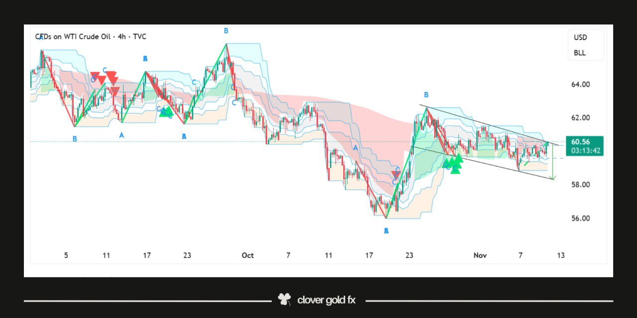 US oil on the 4 hour chart is showing a descending channel pattern where price is moving between two parallel trendlines forming lower highs and lower lows after completing a five wave impulsive structure the current movement appears to be a corrective phase targeting the 61.8% retracement level the overall momentum remains bearish as price continues to respect the upper resistance trendline if price breaks below the channel support it could confirm continuation toward the next key Fibonacci extension level indicating further downside pressure while any rejection from the lower boundary might lead to a short term pullback before the next major move.