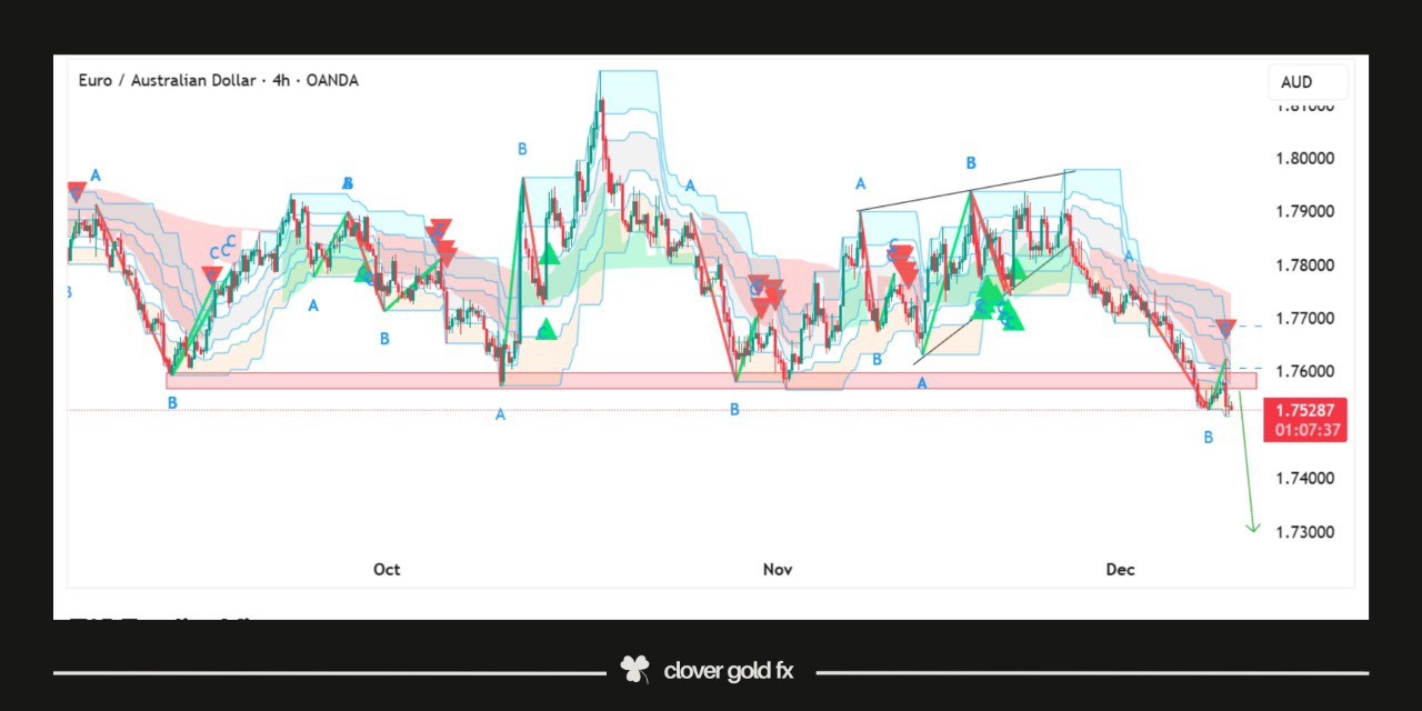 EURAUD on the 4H timeframe is showing a clear bearish structure as the market breaks below the major support zone that has now turned into strong resistance. After completing a corrective ABC cycle followed by a five-wave rising wedge pattern, price failed to sustain higher highs and reversed sharply from the upper trendline. The break and retest of the highlighted zone confirm seller dominance, and the consistent lower lows signal continuation of downside momentum. With the structure shifting fully bearish, the current breakout suggests that EURAUD may extend toward deeper downside targets as long as price remains below the resistance area, giving sellers control and increasing the probability of further decline.