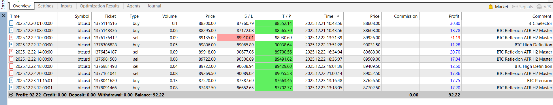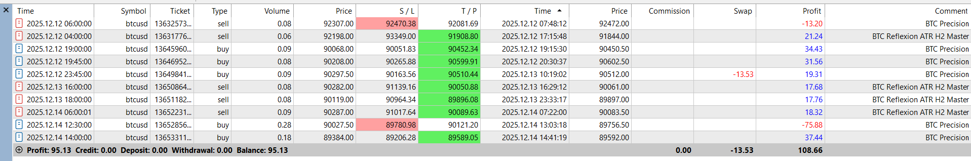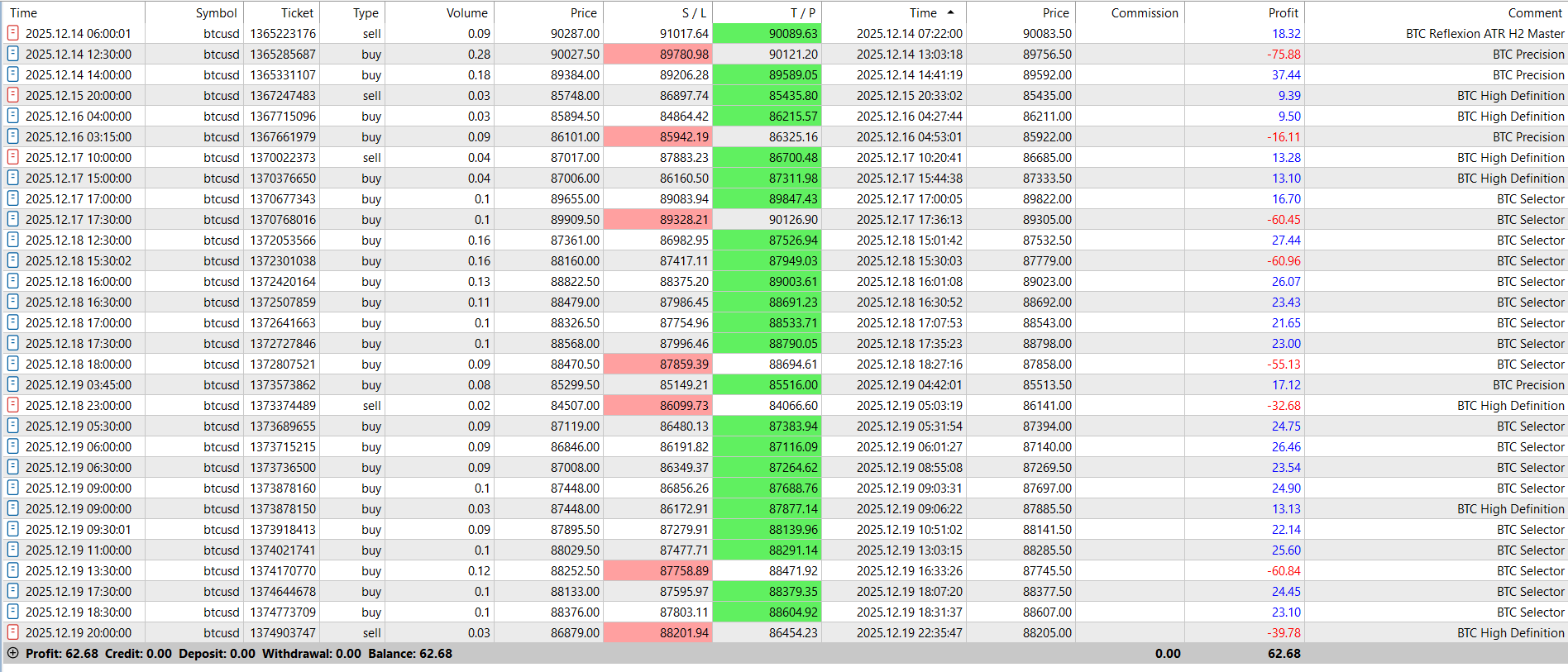 During this trading week, BTCUSD was traded using multiple independent Expert Advisors optimized for H2, each designed with its own logic and ATR-based risk control.