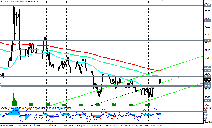 Нефть WTI: в текущих условиях более оправданной выглядит стратегия торговли в рамках диапазона с готовностью к резким движениям при выходе ключевых новостей по теме конфликта. Ключевым уровнем для определения дальнейшего направления станет реакция рынка на зону 200-дневной скользящей средней (62.45) и развитие событий вокруг даты 1 февраля.