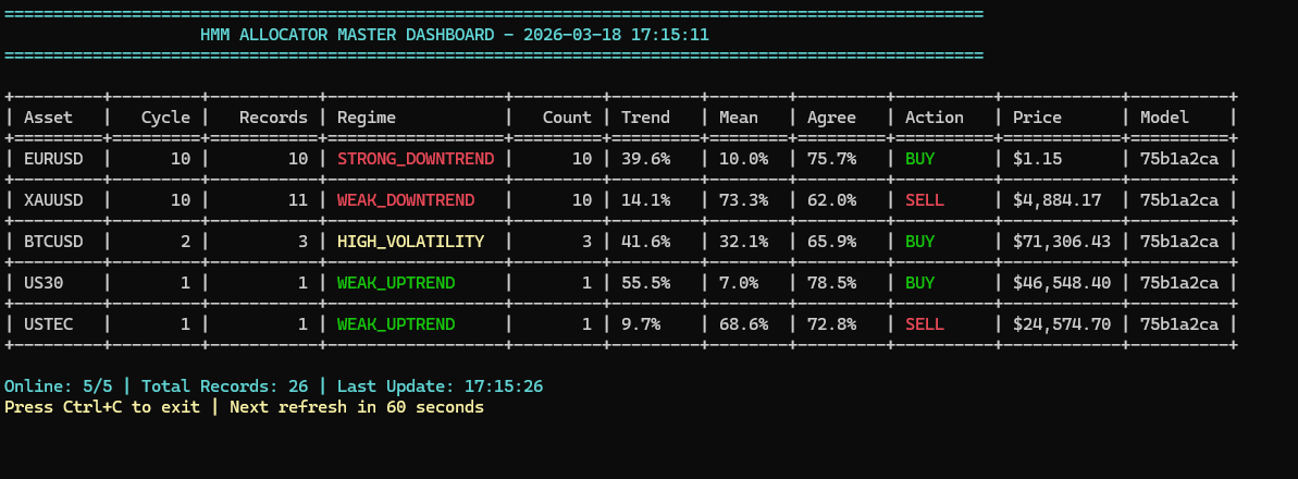 Asset name, cycle count, database records, most common regime, how many times that regime occurred, current action (BUY/SELL/HOLD), latest price, and production model ID for each running instance.