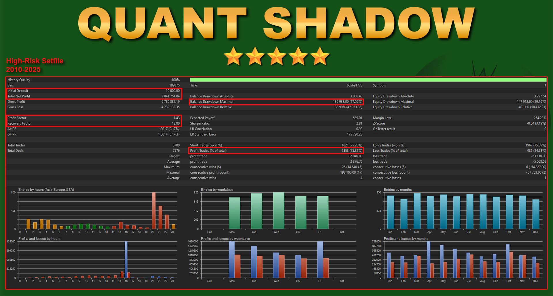 Quant Shadow is a fully automated Expert Advisor engineered exclusively for XAUUSD (Gold). Built on a systematic, rules-based framework, it operates with the precision and discipline of an institutional desk—silently identifying high-probability opportunities during off-market hours and positioning itself before the market moves.