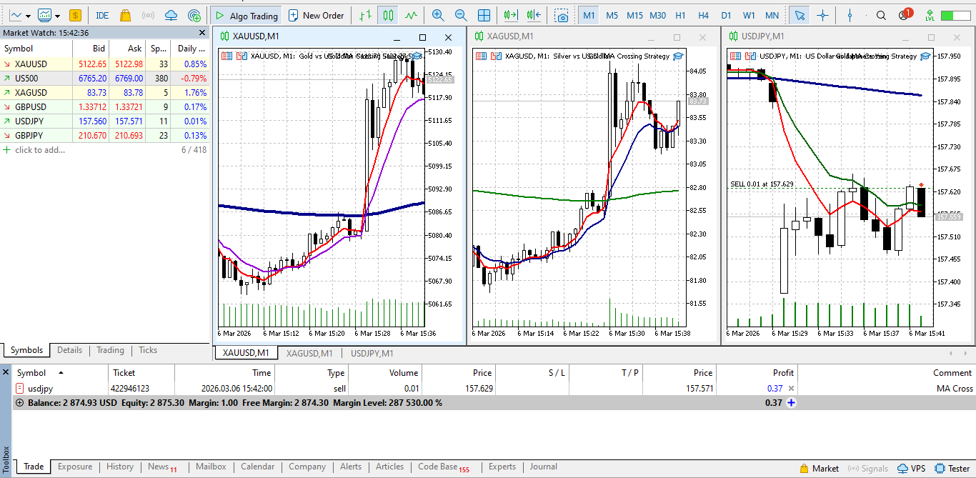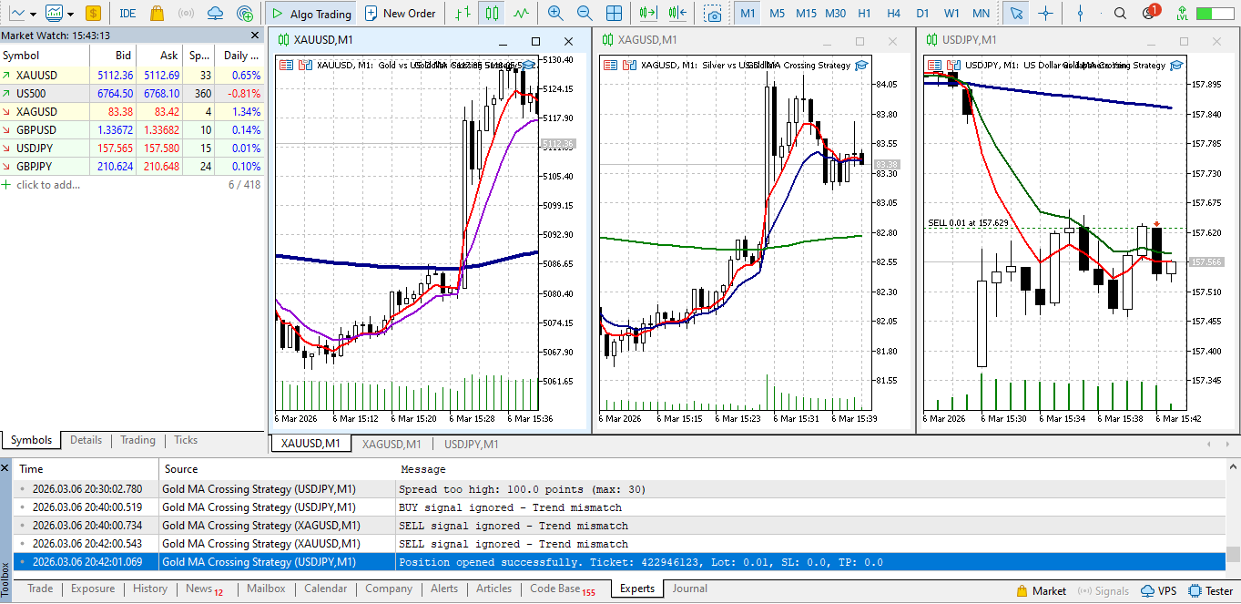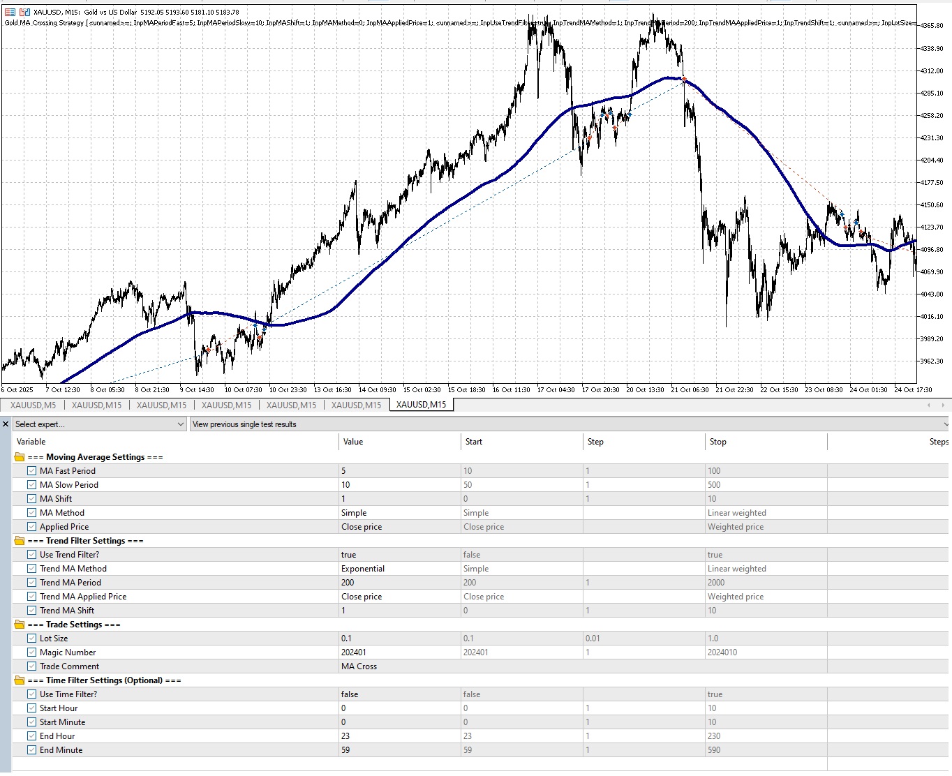 📈 MA Cross 5/10 EA mit Trendfilter Dieser Expert Advisor (EA) ist ein automatisiertes Handelssystem, das auf einer einfachen und bewährten Moving Average Crossover-Strategie basiert. Er eröffnet Trades, wenn ein schneller gleitender Durchschnitt einen langsamen gleitenden Durchschnitt kreuzt, und verwendet einen optionalen Trendfilter, um den Handel gegen die Hauptmarktrichtung zu vermeiden. Dieser EA wurde für Anfänger und fortgeschrittene Trader entwickelt und konzentriert sich auf Klarheit