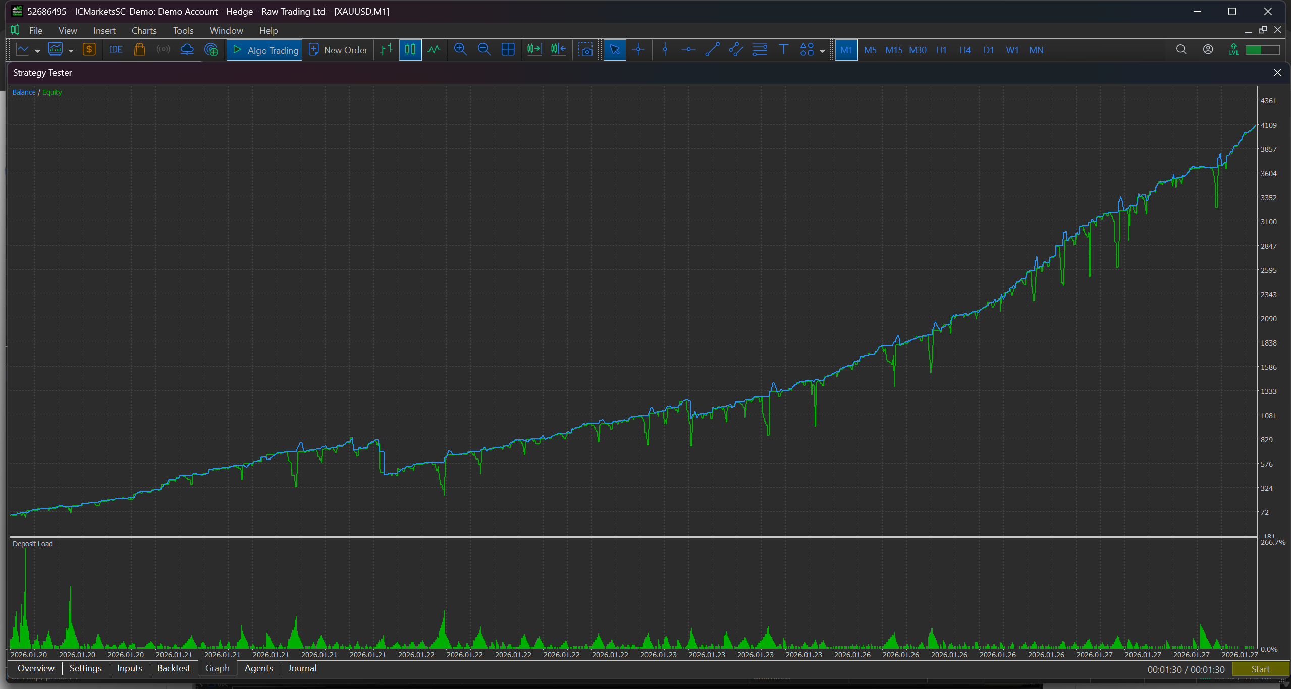 Galileo Pro3 demonstrates strong adaptive trading behavior driven by market sentiment. The equity curve shows consistent growth with controlled drawdowns, highlighting precise market entries based on volume analysis and bullish/bearish candle pressure. After losing trades, the system adapts and improves execution accuracy in subsequent trades. This performance reflects a 1-week trading period on XAUUSD, starting with a balance of $40 and reaching an ending balance of $4,056.