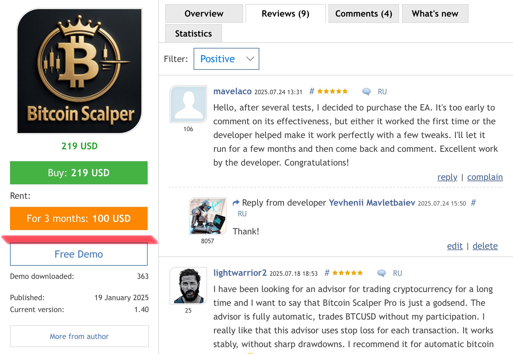Many traders have already purchased the advisor and left their enthusiastic reviews about its work. Become a happy owner of Bitcoin Scalper Pro now! 👉 https://www.mql5.com/en/market/product/130142