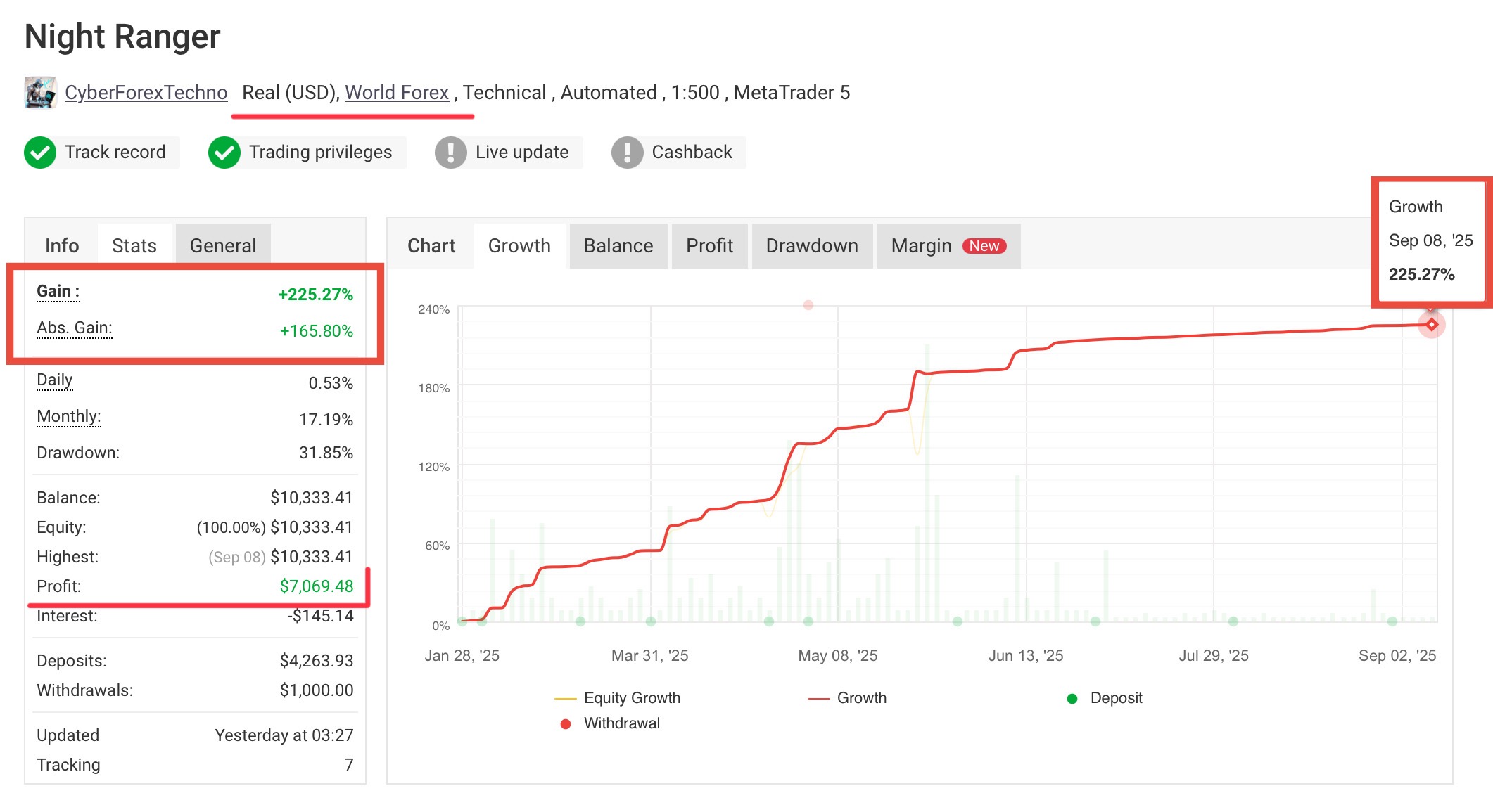The "Night Ranger" advisor has brought 225.27% profit since the beginning of the year.