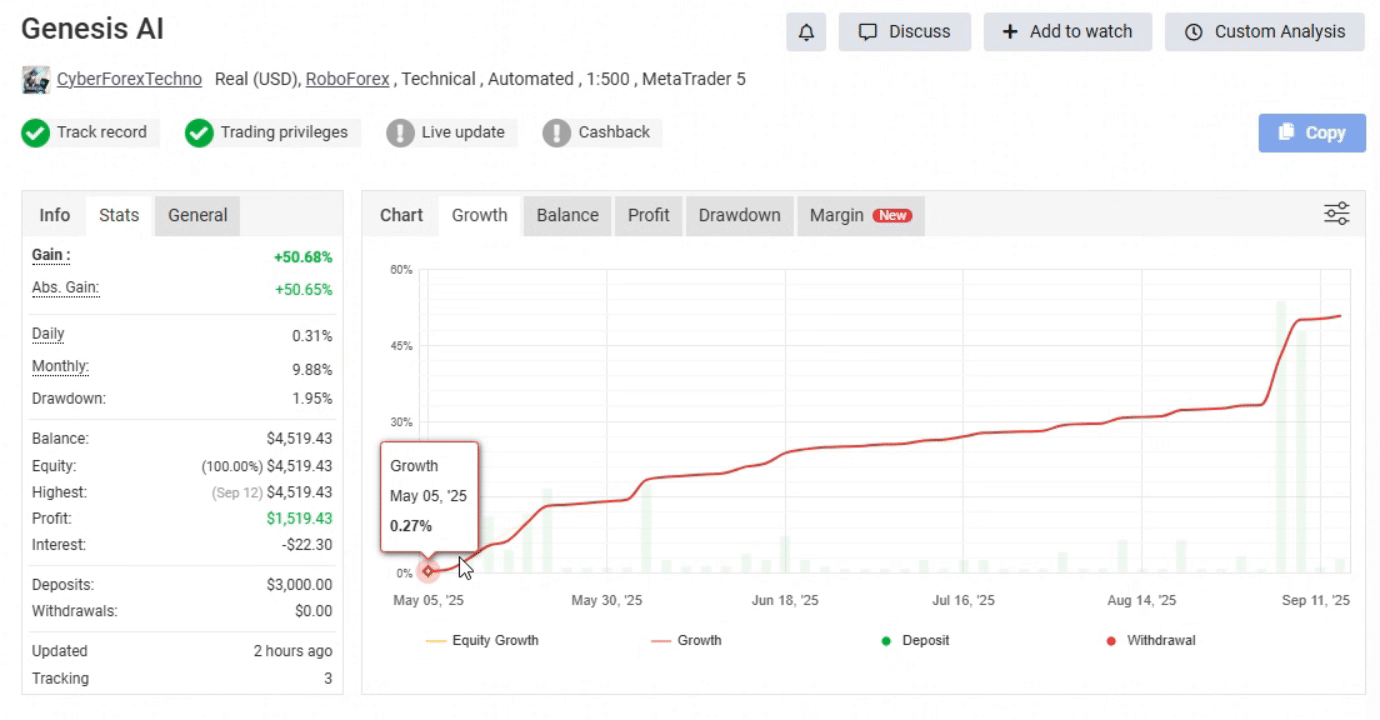 Genesis AI shows excellent results. +50.68% $1,519.43 net profit with minimal drawdown.