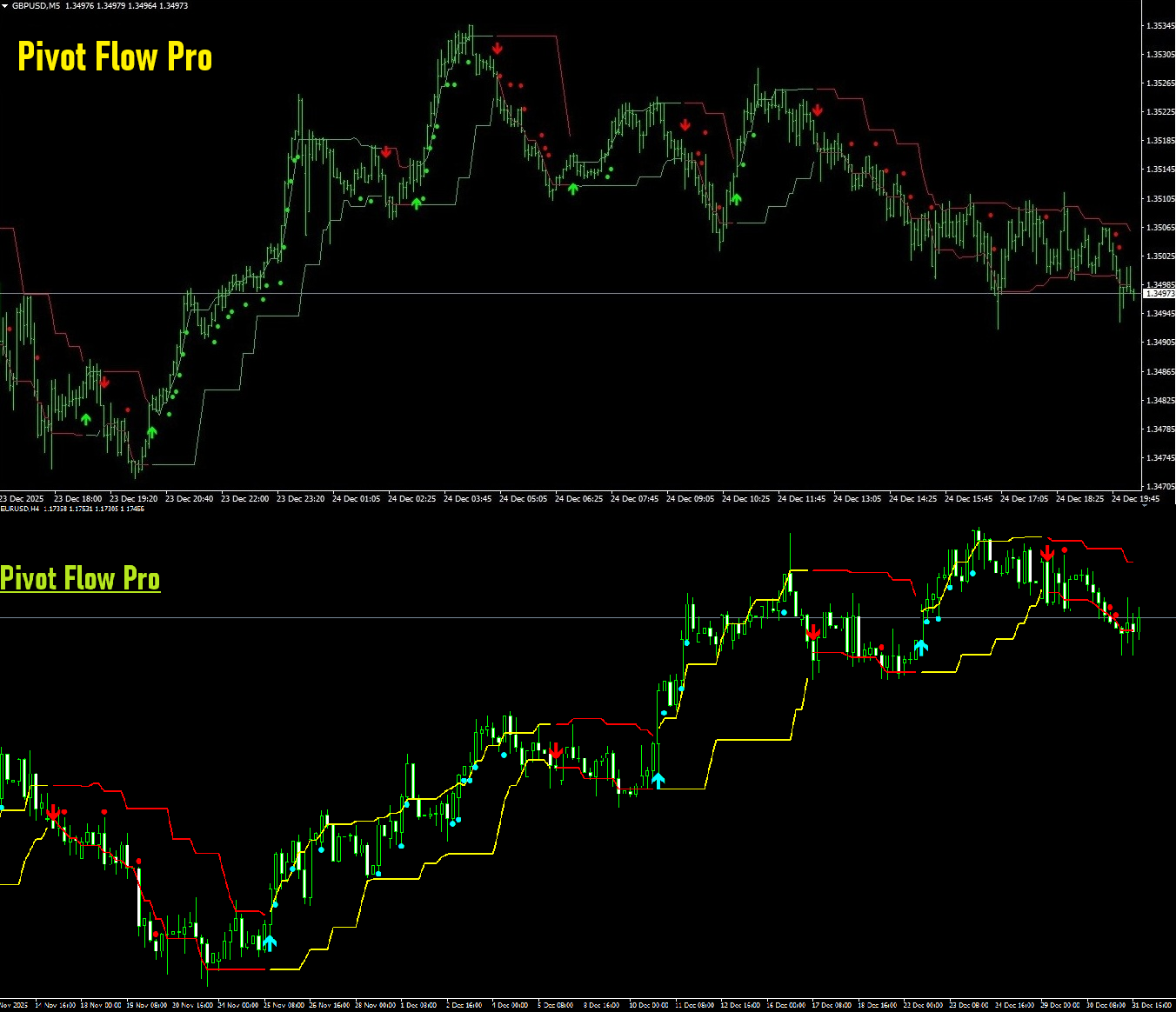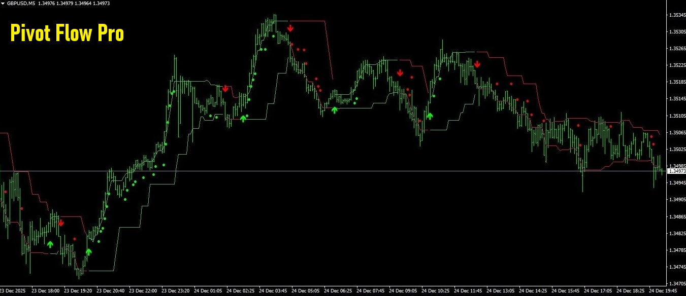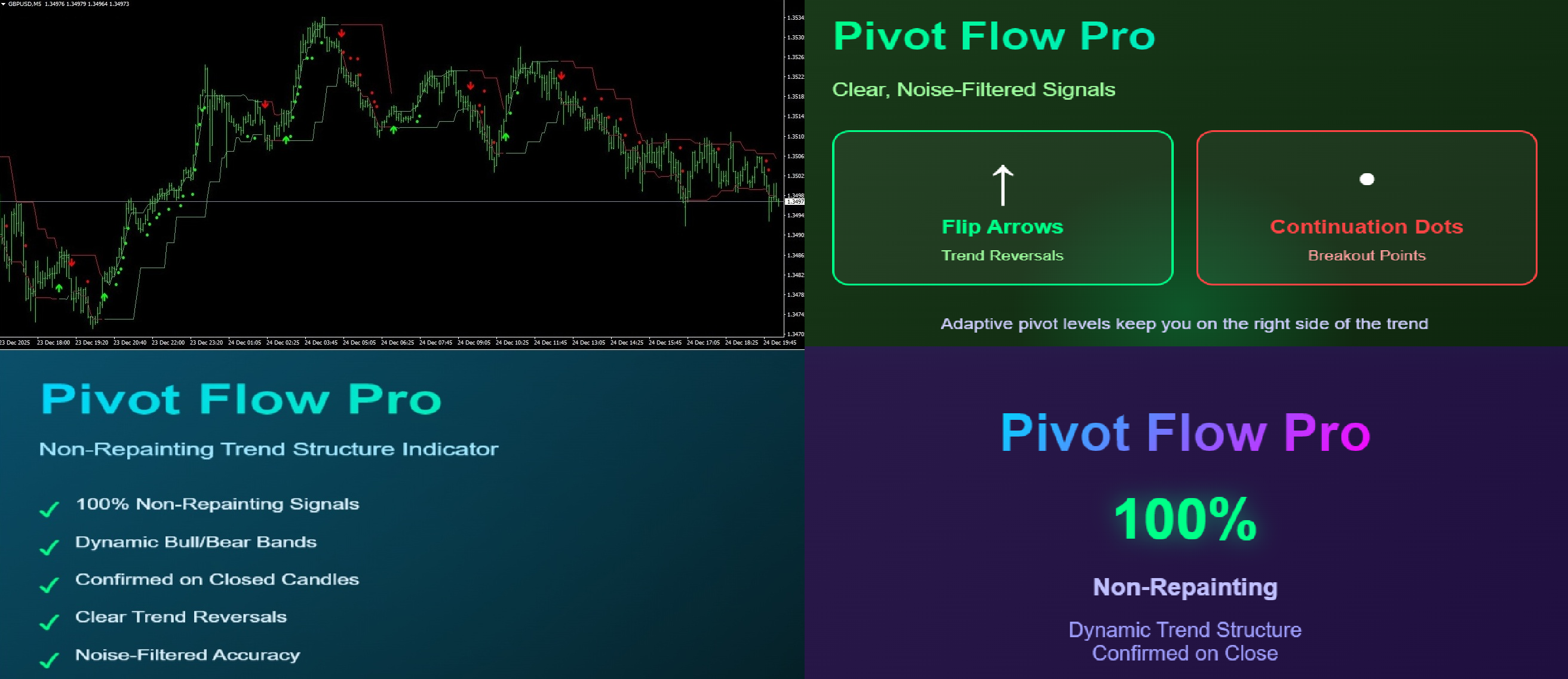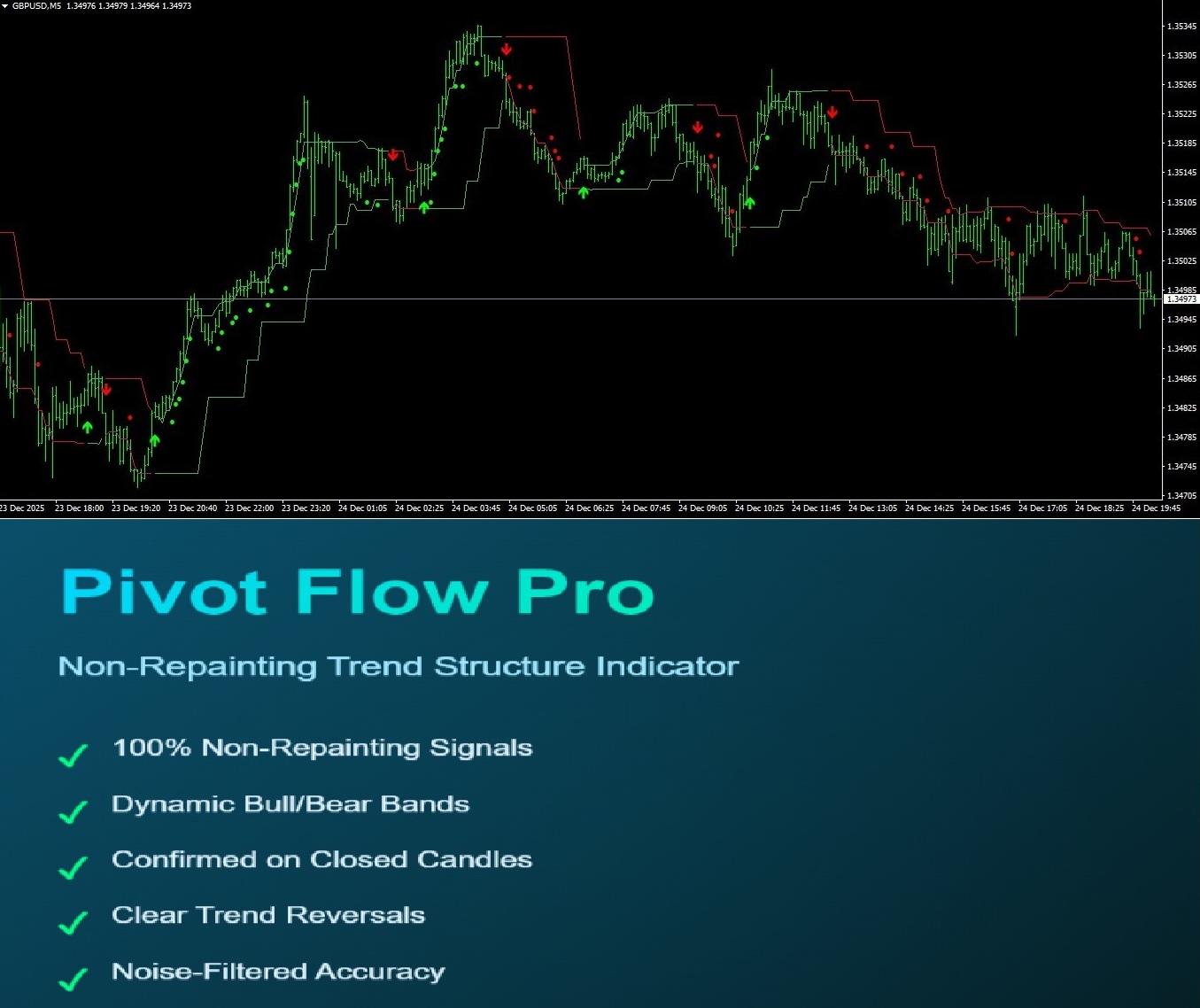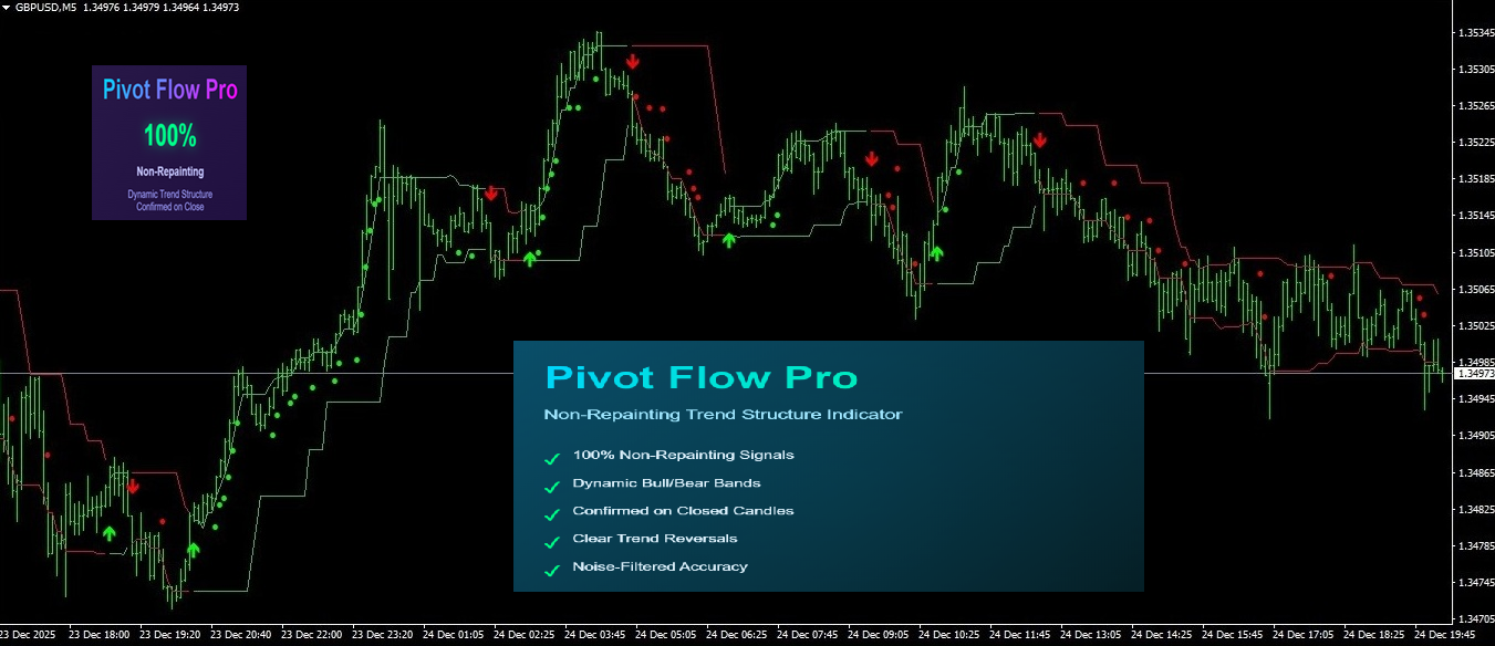 Non-repainting trend-structure indicator that identifies market direction using averaged pivot highs and lows to form a dynamic bull/bear band, with signals confirmed strictly on closed candles. When price closes above or below the adaptive pivot levels, the indicator shifts trend and prints a flip arrow, while continuation dots highlight valid breakout points in the direction of the current structure—giving you a clear, noise-filtered view of trend reversals and trend momentum.