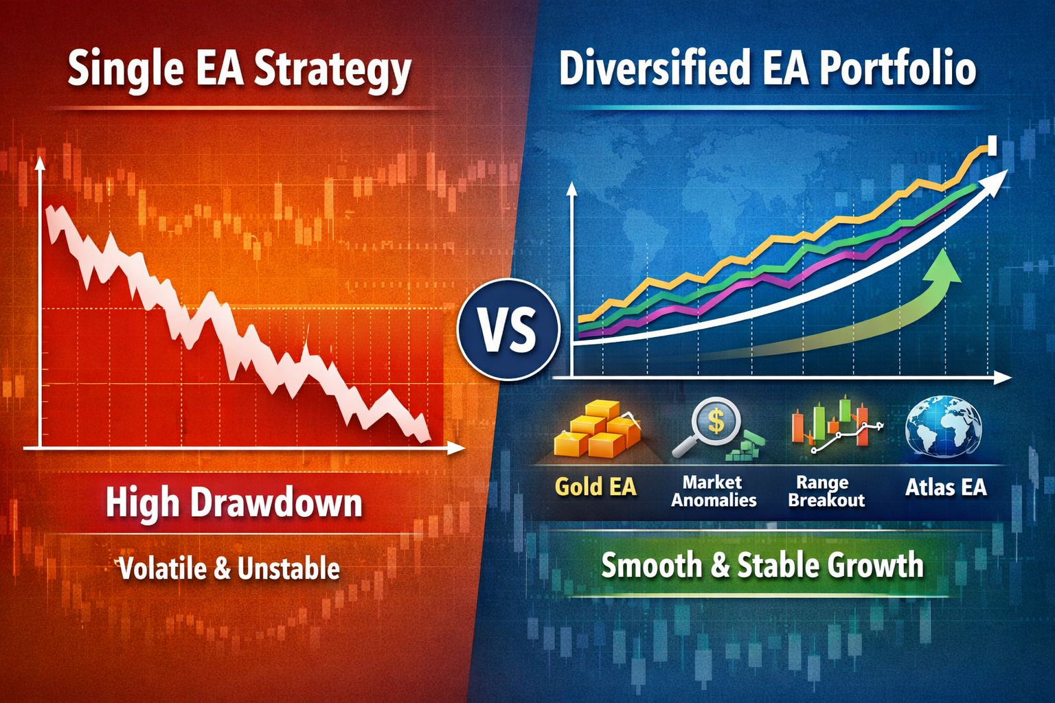 Why Trading a Portfolio of EAs Is So Powerful Many traders focus all their capital on one single EA. If it performs well in backtests and has worked for years, it feels “safe”. But in professional trading, this is one of the biggest hidden risks you can take...