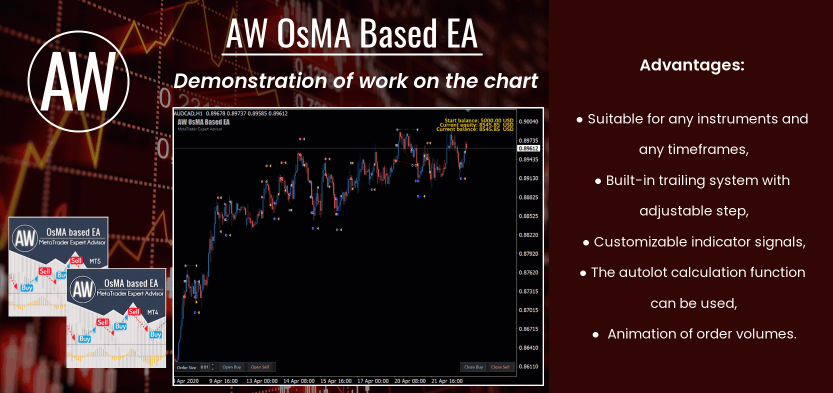 Fully automated trading robot. It works on the signals of the standard OsMA indicator. Built-in automatic lot calculation function, multiplication of volumes for opening orders. Customizable indicator parameters for EA calculations. Complemented with trailing system with adjustable pitch.
