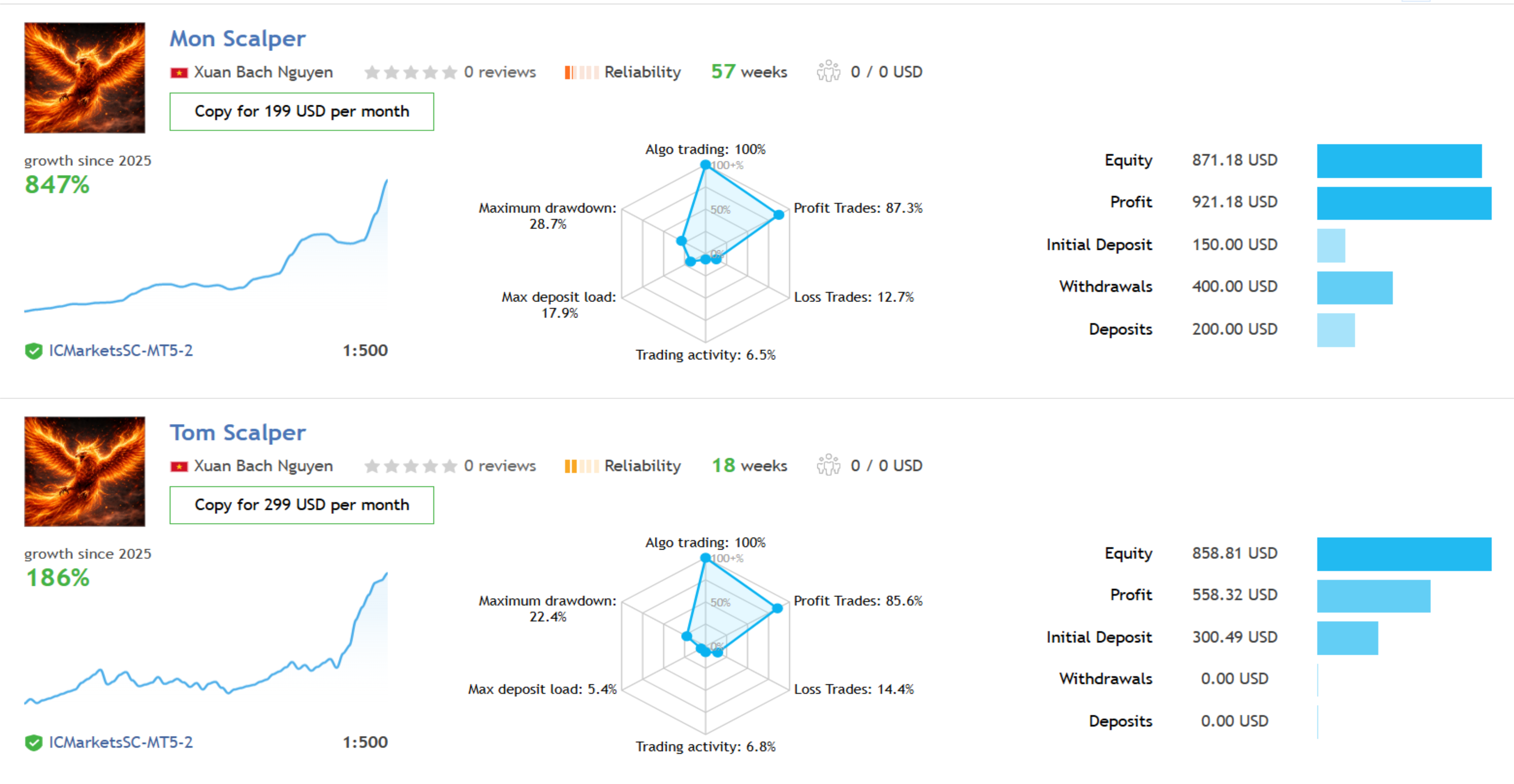 Mon Scalper - Dual-Trendline Breakout Scalping Expert Mon Scalper ist ein spezieller Expert Advisor, der ausschließlich für den Goldhandel (XAUUSD) entwickelt wurde. Er nutzt eine einzigartige Dual-Trendline-Strategie, um starke Trends und Ausbruchspunkte zu identifizieren und führt automatisch Trades auf Basis der Marktbedingungen aus. Treten Sie meinem MQL5-Kanal für die neuesten Updates bei! Real-Time Signal : https://www.mql5.com/en/signals/2281529 Pricing : Launch Price : $199