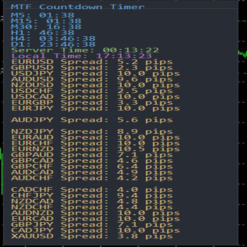 MTF (Multi-Timeframe) Countdown Timer indicator, designed for MetaTrader 4 (MT4). The indicator displays the remaining time for new candles across multiple timeframes, along with other essential trading information such as server time, local time, and the spread of custom currency pairs.