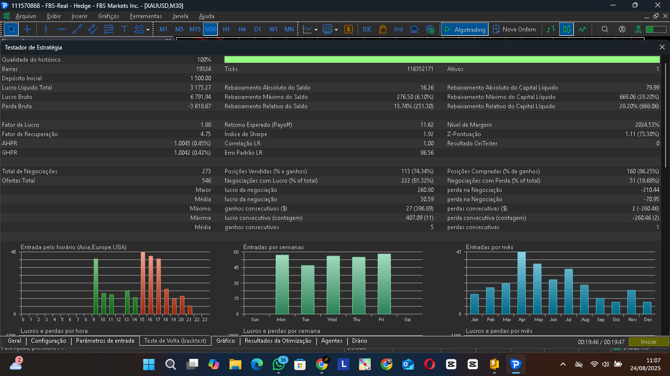 The system was tested in backtesting with 100% historical quality in real ticks (2024 to 25.08.2025 the present), ensuring reliable, realistic, and consistent results.