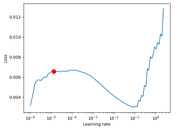 res = Tuner(trainer).lr_find( tft, train_dataloaders=train_dataloader, val_dataloaders=val_dataloader, max_lr=10.0, min_lr=1e-6, ) optimal_lr = res.suggestion() print(f"suggested learning rate: {optimal_lr}") fig = res.plot(show=False, suggest=True) plots_path = os.path.join(outputs_dir, "Plots") os.makedirs(plots_path, exist_ok=True) fig.savefig(os.path.join(plots_path, "lr_finder.png"))