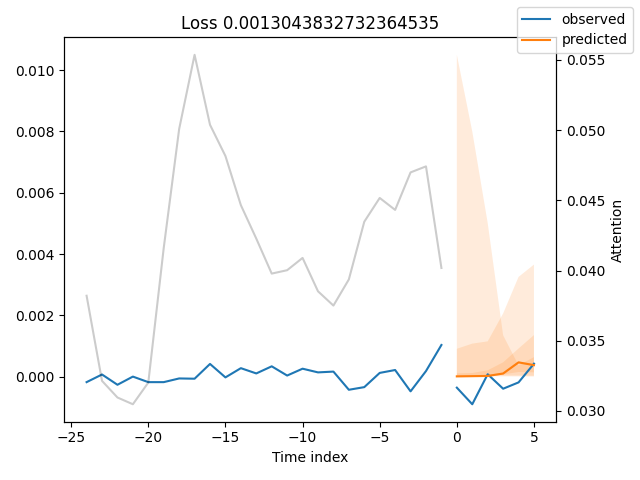 best_model_path = trainer.checkpoint_callback.best_model_path best_tft = TemporalFusionTransformer.load_from_checkpoint(best_model_path) # raw predictions are a dictionary from which all kinds of information, including quantiles, can be extracted raw_predictions = best_tft.predict( val_dataloader, mode="raw", return_x=True, trainer_kwargs=dict(accelerator="cpu") ) n = raw_predictions.output.prediction.shape[0] print(f"Plotting {n} predictions...") for idx in range(n): fig = best_tft.plot_prediction( raw_predictions.x, raw_predictions.output, idx=idx, add_loss_to_title=True ) fig.savefig(os.path.join(plots_path, f"tft_prediction_{idx}.png")) plt.close(fig=fig)