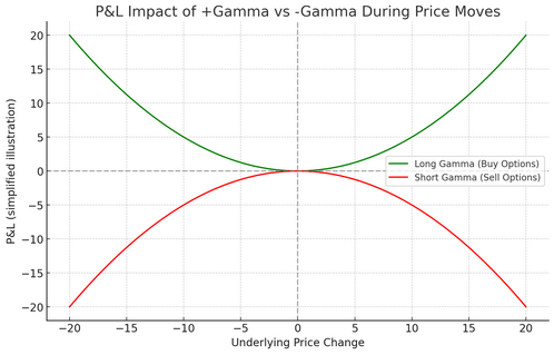 The payoff impact of +Gamma vs -Gamma: profits grow when the market makes large moves (either up or down). This is why long gamma traders want volatility. Losses accelerate when the market makes large moves. Short gamma traders only profit if the market stays calm (low volatility).