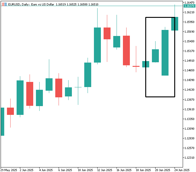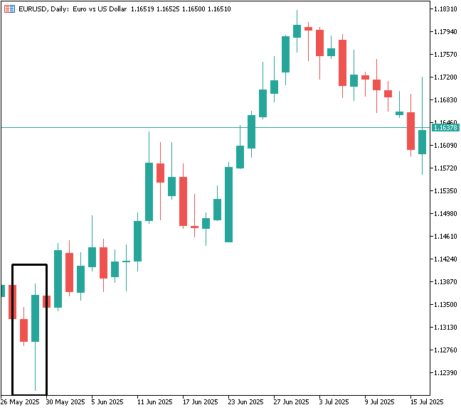The second improvement is more technical and relates to how backtesting operates on the MetaTrader 5 platform. When backtesting a trading robot in MetaTrader 5, the simulation begins at the very start of each candle — at midnight. As a result, any trading logic that depends on a fully formed daily candle’s open, high, low, and close values becomes ineffective at that point. From an MQL5 perspective, it is therefore more practical to treat the pattern as a three-candle structure, where each new day references both the previous day and the one before it.