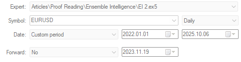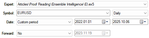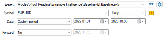 Load the benchmark application and set our test dates accordingly. We have selected more than three years of daily EURUSD data for this exercise, spanning from January 2022 to January 2025.