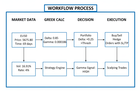 The automation process involves implementing real-time calculations of Black-Scholes Greeks, specifically delta and gamma, based on the current market price of EU50, the predetermined strike price, and time to expiration. The system will constantly track the portfolio's overall delta exposure, which combines the delta from our option positions with any hedging positions in the underlying asset. When the portfolio's net delta deviates beyond a specified threshold from zero, the system will automatically execute trades in the underlying EU50 to rebalance back to delta neutrality. Simultaneously, we'll implement gamma scalping logic that identifies periods of high gamma sensitivity—when the option's delta is most responsive to price changes—to execute strategic trades that profit from these heightened sensitivity periods.