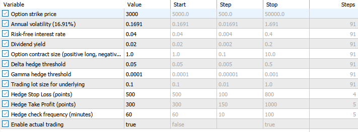 The global variables prepare the EA for real-time computation and execution. The CTrade trade object handles all buy and sell operations on the underlying instrument used for hedging. currentDelta and currentGamma store the latest calculated Greeks, while portfolioDelta and targetDelta help track how far the current exposure is from the desired hedge state (usually near zero for delta-neutral strategies). lastHedgeTime and currentHedgeFrequency are used to regulate how often the system evaluates the hedge, ensuring that the algorithm does not overtrade while still reacting quickly enough to market changes. Together, these variables form the backbone of an automated Black-Scholes hedging engine that continuously monitors risk and executes micro-adjustments in real time.