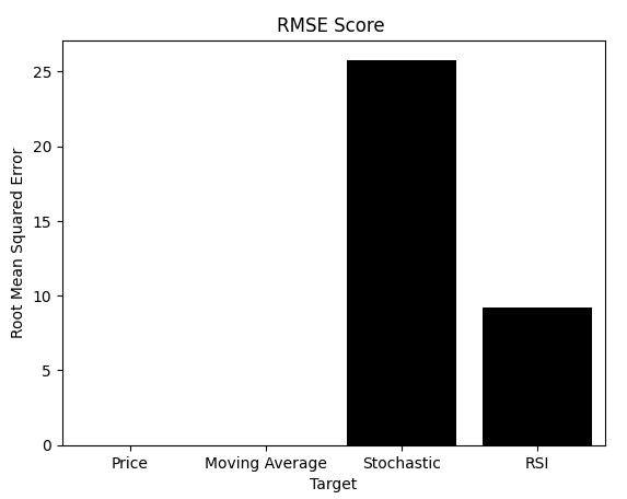 sns.barplot(rmse_scores,color='black') plt.xticks([0,1,2,3],['Price','Moving Average','Stochastic','RSI']) plt.title('RMSE Score ') plt.ylabel('Root Mean Squared Error') plt.xlabel('Target')