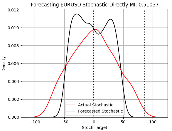 When we evaluate the model forecasting the Stochastic indicator, we see material improvements. Even before considering the dramatic increase in MI, we can see we’ve finally produced a model that does not hug the mean. This model is the only one in our discussion that reasonably resembles the distribution of test observations and captures the market’s width better than the prior models.