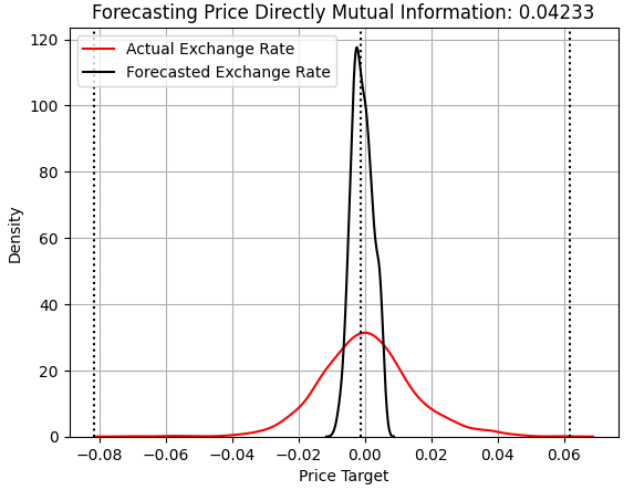 Note that the MI score is recorded alongside the RMSE value. Only the MI score is shown in the title of the Kernel Density Estimate graph. The price model achieved an MI of 0.04233. Recall that MI scores near 0 are undesirable—they indicate that the model’s predictions are independent of real market exchange rates.