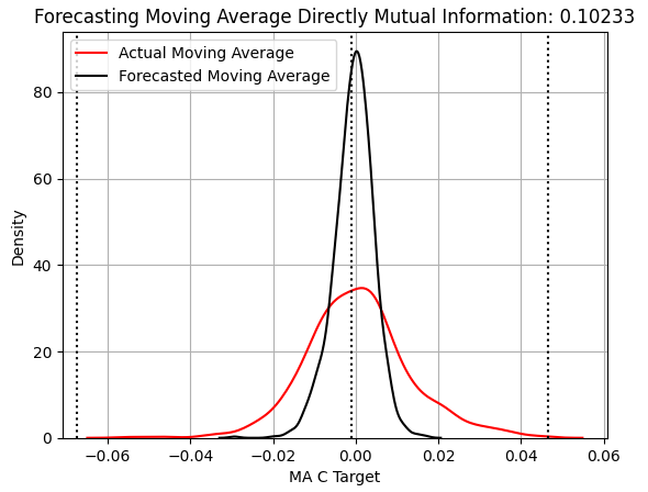 Let us now consider the performance of a statistical model learning to expect changes in the Close Moving Average indicator. The same style of presentation is used throughout our graphs, so we can quickly observe that this model still fails to capture the width of the target—though its MI score has increased by more than 100%, from 0.04 to 0.1. However, Figure 3’s KDE plot doesn’t make it obvious why the MI score improved.