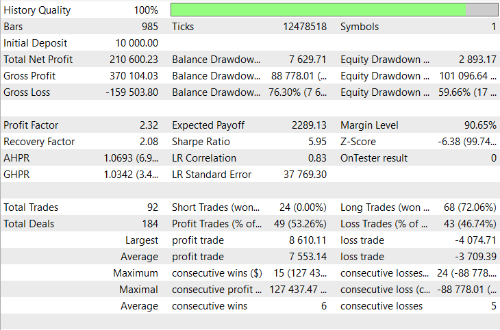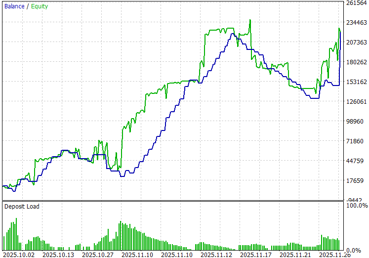 The following backtesting was evaluated on the H1 timeframe across roughly a 2-month testing window (01 October 2025 to 01 December 2025), with the following settings: