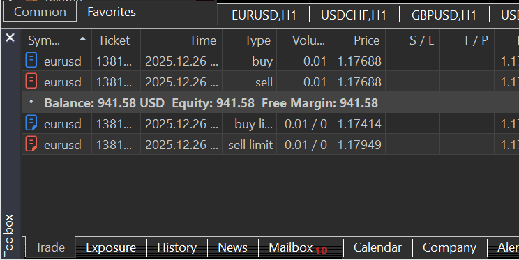 (venv) C:\Users\Omega Joctan\OneDrive\Documents\PyMetaTester>python test.py deals in the last 24 hours in the Simulator: () Deals in the last 24 hours in MetaTrader5: (TradeDeal(ticket=1134768493, order=1381981938, time=1766748992, time_msc=1766748992425, type=0, entry=0, magic=0, position_id=1381981938, reason=0, volume=0.01, price=1.17688, commission=-0.04, swap=0.0, profit=0.0, fee=0.0, symbol='EURUSD', comment='', external_id=''), TradeDeal(ticket=1134768532, order=1381981988, time=1766748994, time_msc=1766748994018, type=1, entry=0, magic=0, position_id=1381981988, reason=0, volume=0.01, price=1.17688, commission=-0.04, swap=0.0, profit=0.0, fee=0.0, symbol='EURUSD', comment='', external_id=''), TradeDeal(ticket=1135016562, order=1381968767, time=1766763381, time_msc=1766763381530, type=1, entry=0, magic=0, position_id=1381968767, reason=0, volume=0.01, price=1.17953, commission=-0.04, swap=0.0, profit=0.0, fee=0.0, symbol='EURUSD', comment='', external_id=''))