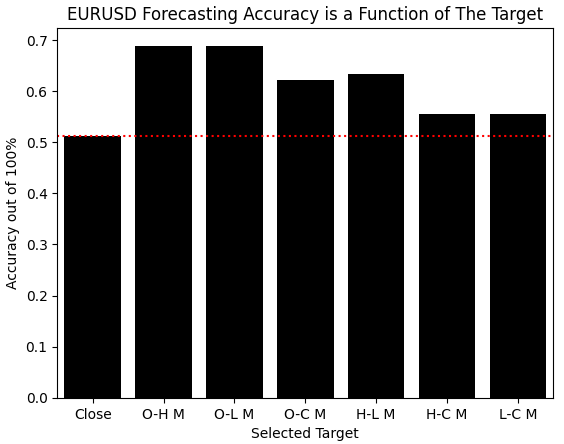 sns.barplot(scores,color='black') plt.xticks([0,1,2,3,4,5,6],candidate_y) plt.axhline(scores[0],linestyle=':',color='red') plt.ylabel('Accuracy out of 100%') plt.xlabel('Selected Target') plt.title('EURUSD Forecasting Accuracy is a Function of The Target')
