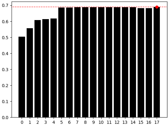 sns.barplot(res,color='black') plt.axhline(np.max(res),color='red',linestyle=':') plt.scatter(np.argmax(res),np.max(res),color='red')