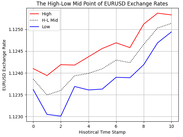 #Examine correctness plt.plot(data.loc[0:10,'High'],color='red') plt.plot(data.loc[0:10,'H-L M'],color='black',linestyle=':') plt.plot(data.loc[0:10,'Low'],color='blue') plt.grid() plt.legend(['High','H-L Mid','Low']) plt.ylabel('EURUSD Exchange Rate') plt.xlabel('Hisotircal Time Stamp') plt.title('The High-Low Mid Point of EURUSD Exchange Rates')