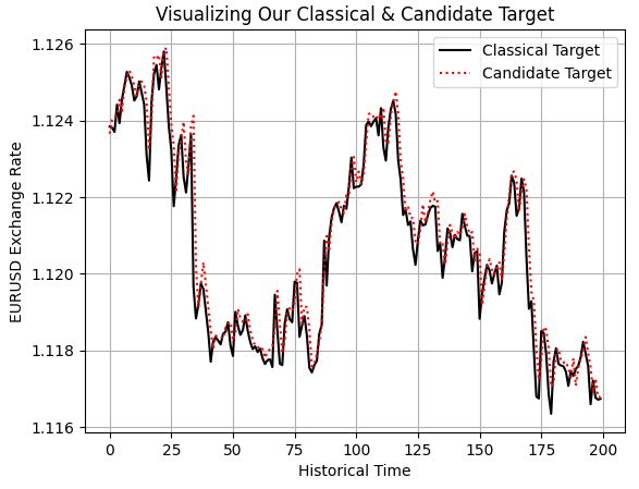 plt.plot(data.iloc[0:200,-14],color='black') plt.plot(data.iloc[0:200,-13],linestyle=':',color='red') plt.grid() plt.ylabel('EURUSD Exchange Rate') plt.xlabel('Historical Time') plt.title('Visualizing Our Classical & Candidate Target') plt.legend(['Classical Target','Candidate Target'])