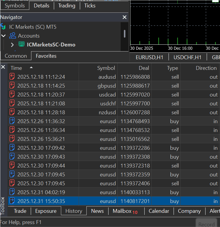 2026-01-05 15:54:50,114 | INFO | tester | [Trade.py:85 - position_open() ] => Position Opened successfully! 2026-01-05 15:54:50,114 | INFO | tester | [Trade.py:85 - position_open() ] => Position Opened successfully! positions in a simulator = 2: (TradePosition(ticket=113127532167305337632, time=1767624887, time_msc=1767624887000, time_update=1767624887, time_update_msc=1767624887000, type=0, magic=112233, identifier=113127532167305337632, reason=3, volume=0.01, price_open=1.16743, sl=0.0, tp=0.0, price_current=1.16743, swap=0, profit=0, symbol='EURUSD', comment='buy pos', external_id=''), TradePosition(ticket=113127532167305337651, time=1767624887, time_msc=1767624887000, time_update=1767624887, time_update_msc=1767624887000, type=1, magic=112233, identifier=113127532167305337651, reason=3, volume=0.01, price_open=1.16743, sl=0.0, tp=0.0, price_current=1.16743, swap=0, profit=0, symbol='EURUSD', comment='sell pos', external_id='')) 2026-01-05 15:54:50,114 | INFO | tester | [Trade.py:397 - position_close() ] => Position 113127532167305337632 closed successfully! positions remaining: (TradePosition(ticket=113127532167305337651, time=1767624887, time_msc=1767624887000, time_update=1767624887, time_update_msc=1767624887000, type=1, magic=112233, identifier=113127532167305337651, reason=3, volume=0.01, price_open=1.16743, sl=0.0, tp=0.0, price_current=1.16743, swap=0, profit=0, symbol='EURUSD', comment='sell pos', external_id=''),)