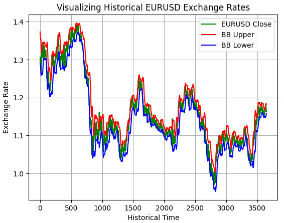 plt.plot(data['Close'],color='green') plt.plot(data['BB Upper'],color='red') plt.plot(data['BB Lower'],color='blue') plt.grid() plt.title('Visualizing Historical EURUSD Exchange Rates') plt.ylabel('Exchange Rate') plt.xlabel('Historical Time') plt.legend(['EURUSD Close','BB Upper','BB Lower'])