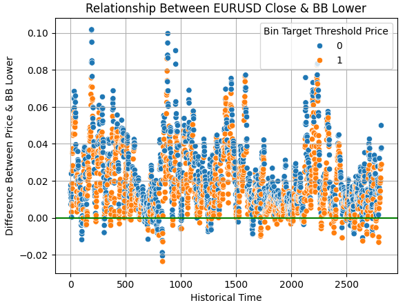 sns.scatterplot(data=train,y=train['Close']-train['BB Lower'],x=np.arange(train.shape[0]),hue='Bin Target Threshold Price') plt.axhline(0,color='green') plt.grid() plt.ylabel('Difference Between Price & BB Lower') plt.xlabel('Historical Time') plt.title('Relationship Between EURUSD Close & BB Lower')