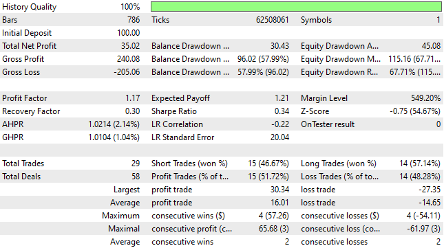 When analyzing the detailed statistics of the new trading strategy, we observe that the total number of trades increased to 29 from an initial total of 14. This represents a 100% improvement and confirms that we succeeded in uncovering additional signal. However, the total net profit declined from $61 to $35, indicating that additional noise was introduced into the strategy. Although the strategy remained profitable, it cannot be considered a success relative to the benchmark performance.