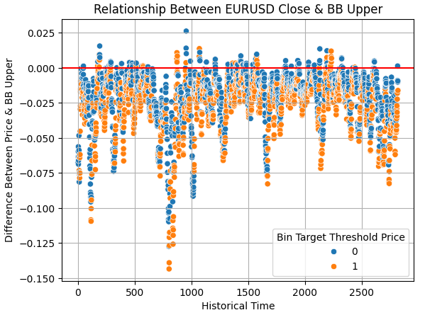 sns.scatterplot(data=train,y=train['Close']-train['BB Upper'],x=np.arange(train.shape[0]),hue='Bin Target Threshold Price') plt.grid() plt.axhline(0,color='red') plt.ylabel('Difference Between Price & BB Upper') plt.xlabel('Historical Time') plt.title('Relationship Between EURUSD Close & BB Upper')